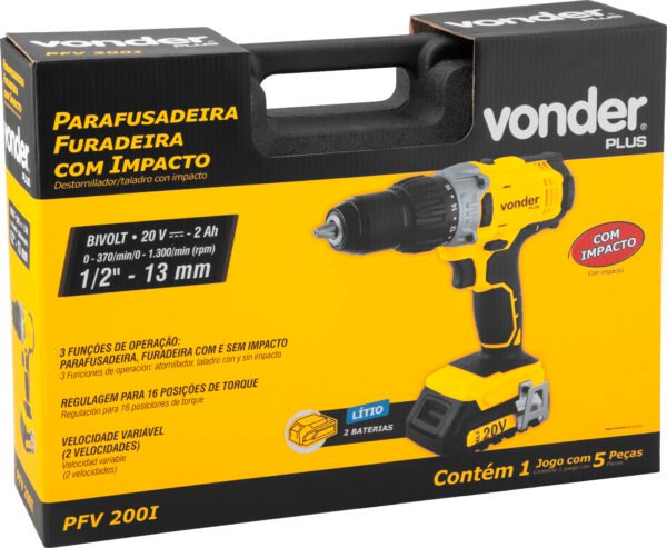 Parafusadeira/furadeira com impacto a bateria, 20 V, fonte de carregamento bivolt automática, PFV 200I, VONDER PLUS